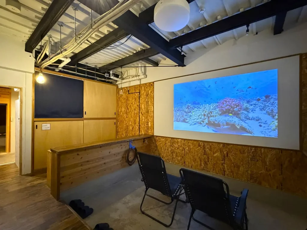 サウナエリアの隣には、プロジェクターを備えたシアタールームを設置。